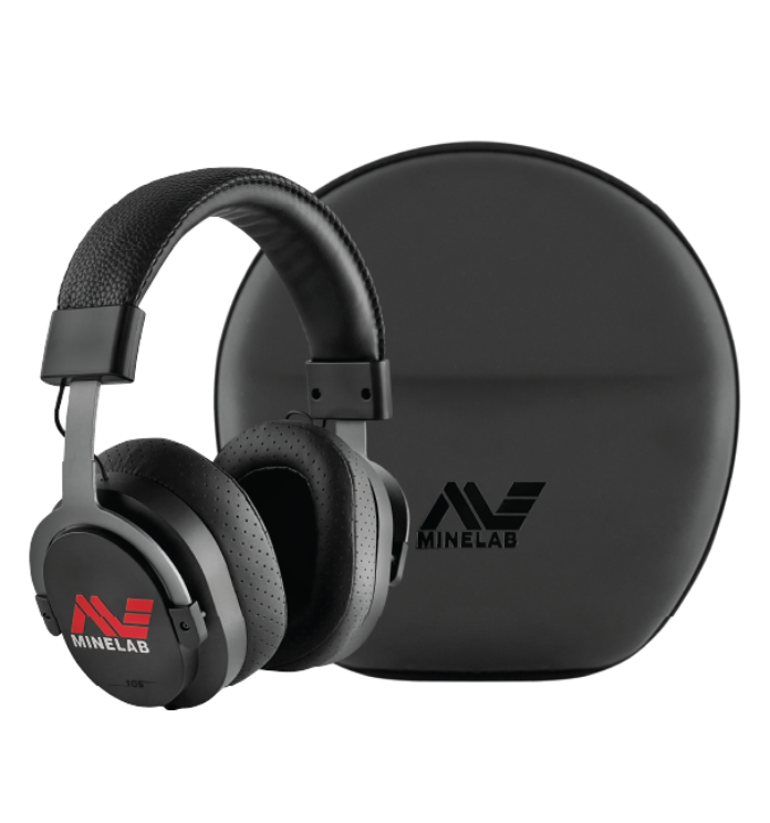 Minelab low-latency wireless headphones, which include a carrying case;