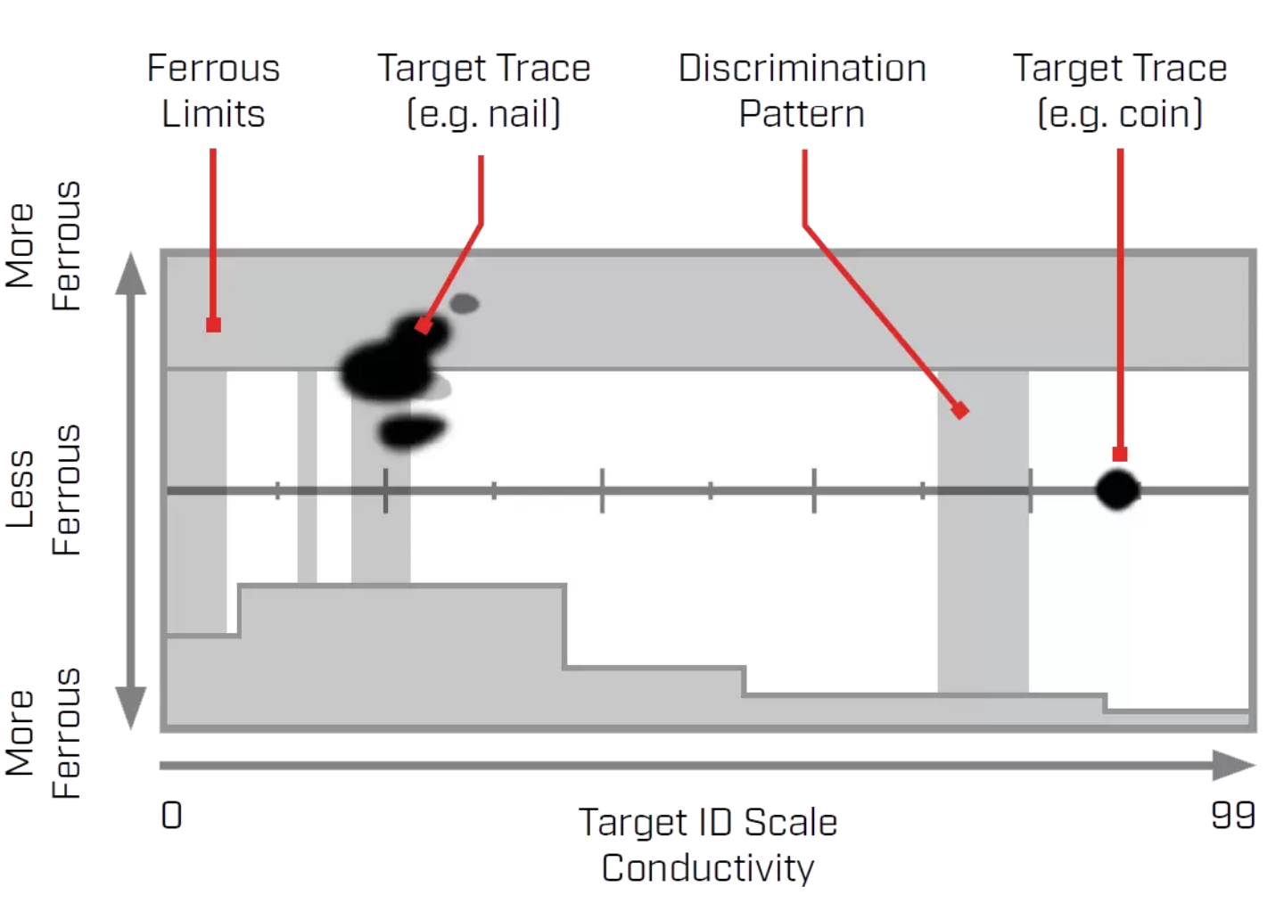Both the ferrous boundaries and the discrimination map are visualized on the identification map. A discrimination map is used to 'hide' targets with certain target IDs or ID ranges, for example ring pulls. The Discrimination map only applies to Target ID, regardless of ferrous determination. Ferrous boundaries are mainly used to identify the boundaries between ferrous and non-ferrous targets. Some regions have coins made from ferrous materials that could be easily hidden if all ferrous targets were hidden. The Ferrous Limits function can be used to open a small window and thus allow ferrous coins to not be masked as ferrous targets.